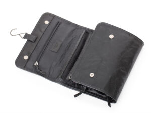 Tato závěsná toaletní taška je ideálním společníkem pro byznys cesty i dovolené. Vyrobena z prvotřídní byvolí kůže Black, kombinuje luxusní vzhled s maximální funkčností. Háček na zavěšení umožňuje snadný přístup ke všem toaletním potřebám i v malých hotelových koupelnách. Vnitřek je vybaven nepromokavou podšívkou pro ochranu kůže.